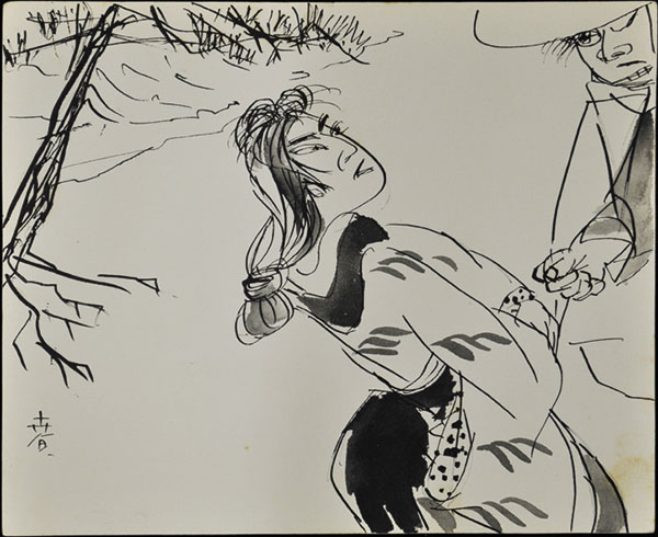 中央区では、長谷川春子が手掛けた作品のうち、新聞小説などに掲載された挿絵の原画87枚や単色線(鉛筆・ペン・コンテなどの画材)で形象や陰影を粗く描いた素描画210枚を所蔵しています。こうした画稿(印刷のための絵の原稿)の類は、長期保存されることが少ないため希少な資料といえます。原画の中には、小島政二郎(こじままさじろう)(1894から1994)による新聞小説「次郎長日向(じろちょうひなた)」(昭和28年から昭和29年『京都新聞』夕刊に連載)の挿絵や源氏鶏太(げんじけいた)(1912から1985)の長編小説「意気に感ず」(昭和39年『週刊現代』に連載)に掲載された挿絵の素描も確認できます。